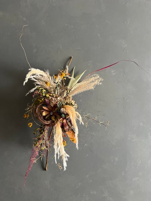 自然光に映える、落ち着いた色味のドライフラワーを束ねた